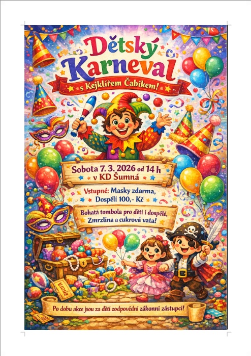 Dětský karneval Šumná 7.3.2026 od 14 hod v KD Šumná
